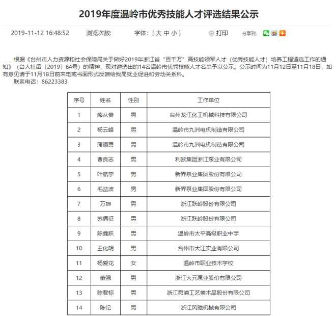 為高水平建設人才強省,進一步加快高技能人才隊伍建設,我司根據(jù)《臺州市人力資源和社會保障局關于做好2019年浙江省“百千萬”高技能領軍人才培養(yǎng)工程遴選工作的通知》要求,通過我司推薦,經(jīng)資格初審、評委會評審等環(huán)節(jié),我司研發(fā)中心陳紀被評選為溫嶺市優(yōu)秀技能人才,并在網(wǎng)上予以公示,符合公司的價值觀 “客戶為先、誠信負責、團隊合作、務實創(chuàng)新”精神。