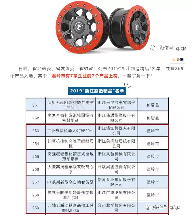 為全面提升“浙江制造”品牌形象,深入推進(jìn)實(shí)施“四換三名”工程,推動(dòng)企業(yè)提升創(chuàng)新能力、品牌培育和市場(chǎng)開(kāi)拓力度,扶持并推廣應(yīng)用一批“技術(shù)先進(jìn)、設(shè)計(jì)新穎、質(zhì)量可靠、效益優(yōu)良”的浙江制造產(chǎn)品,公司響應(yīng)風(fēng)馳于2019響應(yīng)政府號(hào)召積極參與“浙江制造精品”申報(bào),通過(guò)省經(jīng)信委、省發(fā)改委、省財(cái)經(jīng)廳聯(lián)合開(kāi)展評(píng)選,風(fēng)馳的《高強(qiáng)度輕量化滾壓式全地形車(chē)鋼圈》上榜入選為2019“浙江制造精品”名單,同時(shí)根據(jù)市政府鼓勵(lì)企業(yè)開(kāi)發(fā)新產(chǎn)品的規(guī)定,公司將予以獲得30萬(wàn)元的獎(jiǎng)勵(lì)。