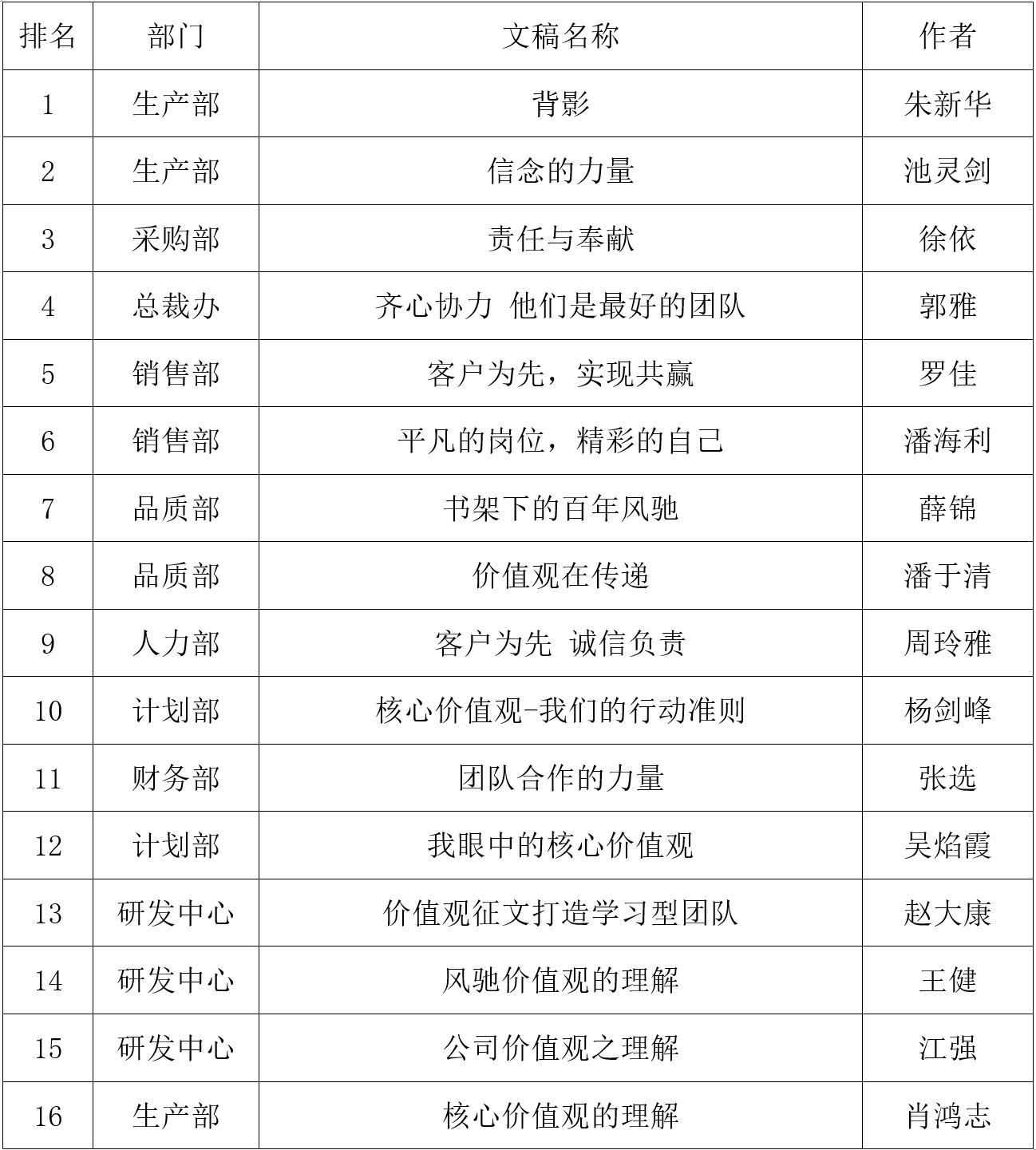 首先,評審組10位評委根據(jù)價(jià)值觀主題、文稿內(nèi)容,觀點(diǎn)表達(dá)清晰度,事實(shí)案例,語言表達(dá)流暢,文稿整體結(jié)構(gòu)完整性,幾個方面對稿件進(jìn)行了認(rèn)真的打分,再依據(jù)分值排名匯總至執(zhí)行總裁最終審核,得出最終評審結(jié)果:生產(chǎn)部朱新華的《背影》一文一舉奪魁,文中沒有華麗的文字,沒有網(wǎng)紅的心靈雞湯,只是簡單的言語,背后卻道出了我們公司的價(jià)值觀,平凡崗位上忙碌的背影深深印刻在每位風(fēng)馳人的心中,文章獲得評委們的一致好評。生產(chǎn)部池靈劍的《信念的力量》立場鮮明,主題突出,讓人感到信念的是一種熱烈的,一種噴薄而出,一種昂揚(yáng)斗志的力量,喜獲二等獎;采購部徐依的《責(zé)任與豐獻(xiàn)》,總裁辦郭雅的《齊心協(xié)力,他們是最好的團(tuán)隊(duì)》并列三等獎。