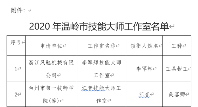 我司根據(jù)《關(guān)于深入實(shí)施2020年度溫嶺市技能大師工作室項(xiàng)目建設(shè)及考核評(píng)估的通知》(溫人社發(fā)〔2020〕59號(hào))文件精神,通過自行推薦以及地方政府的大力支持,充分準(zhǔn)備了相關(guān)申報(bào)資料,通過主管部門的初審以及專家的評(píng)審、部門審議和社會(huì)公示等評(píng)選環(huán)節(jié),我司最終順利通過評(píng)審,被評(píng)定為“李軍輝技能大師工作室”并于政府平臺(tái)公示。
