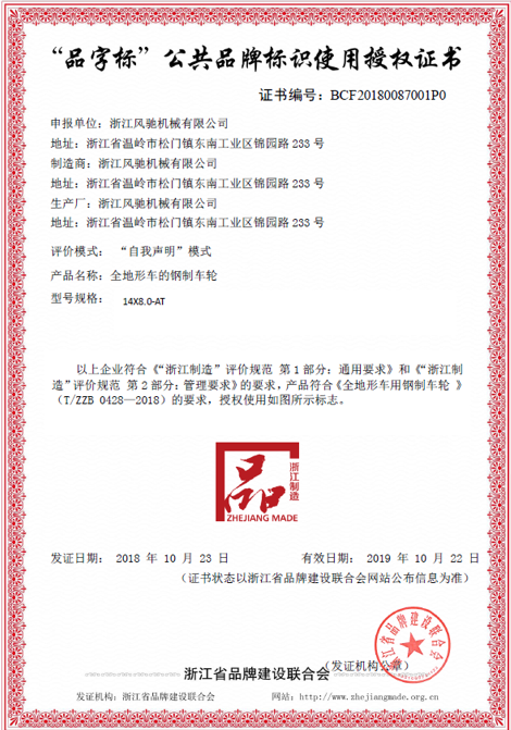 我司是在去年積極響應(yīng)浙江制造品牌建設(shè),在完成上一階段浙江制造團(tuán)體標(biāo)準(zhǔn)《全地形車用鋼制車輪》(T/ZZB 0428-2018)的申報(bào)、審批與發(fā)布實(shí)施后,在此基礎(chǔ)之上,于2018年9月份申報(bào)了“品字標(biāo)公共品牌標(biāo)識”,通過“自我申明”評價(jià)模式及資質(zhì)審核,順利通過評審,獲得了“品字標(biāo)”公共品牌標(biāo)識使用證書。